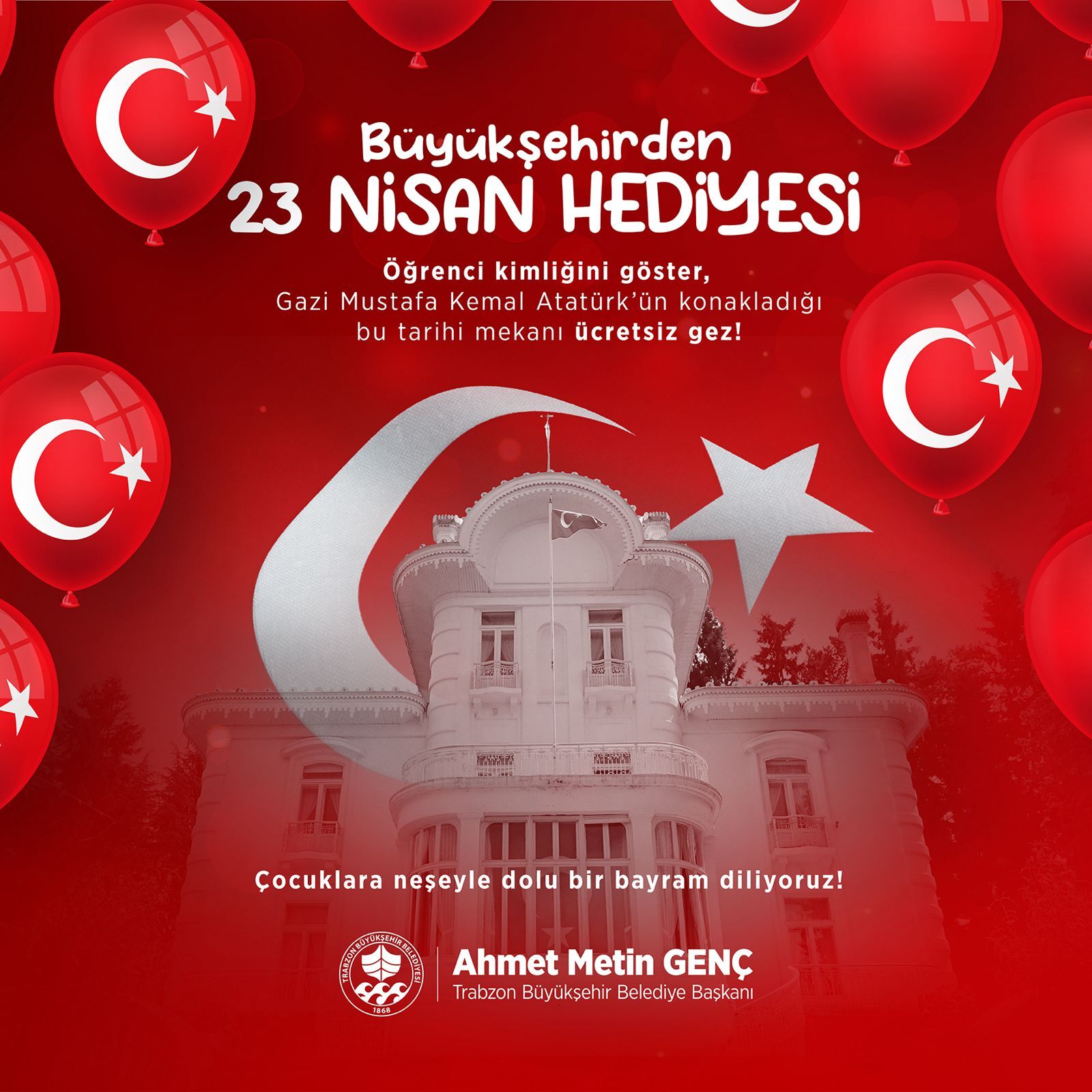 Trabzon Büyükşehir Belediyesi, 23 Nisan Ulusal Egemenlik ve Çocuk Bayramı kapsamında ilkokul ve ortaokul öğrencilerini Atatürk Köşkü’nde ücretsiz ağırlayacak.