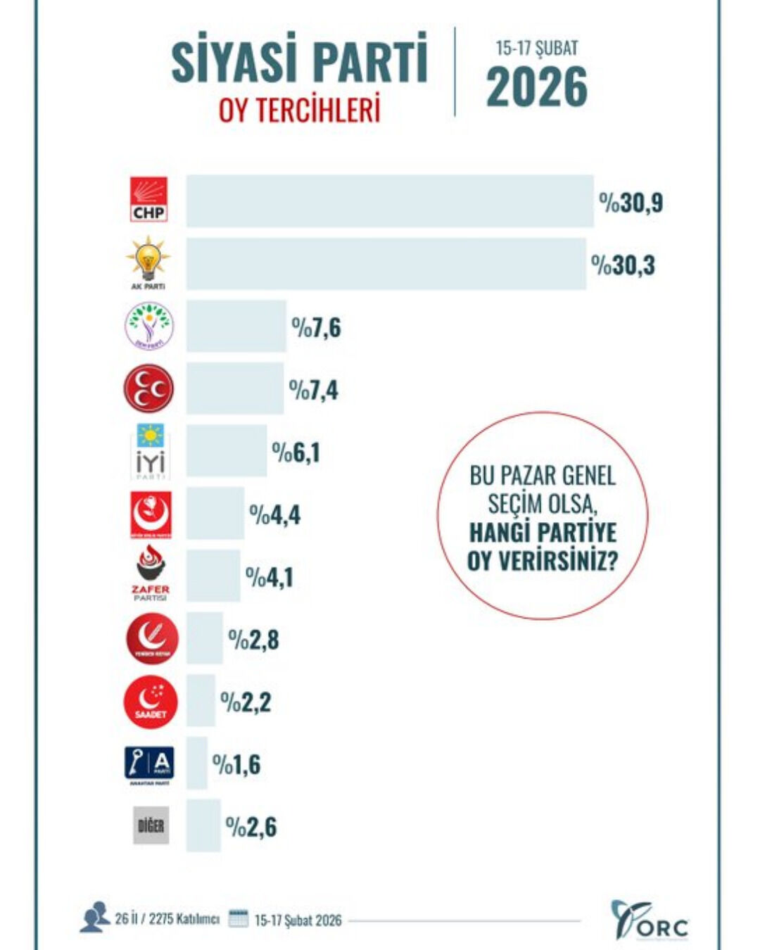 Alt blokta ise dengeler büyük ölçüde korunuyor. DEM Parti %8,9 ile kilit rolünü sürdürürken, MHP %7,6 ile sabit bir çizgide ilerliyor. Bu durum, Cumhur İttifakı’nın toplam oy tabanında ciddi bir kırılma olmadığını, ancak küçük artış ve azalışların bile genel dengeyi etkileyebileceğini gösteriyor.
