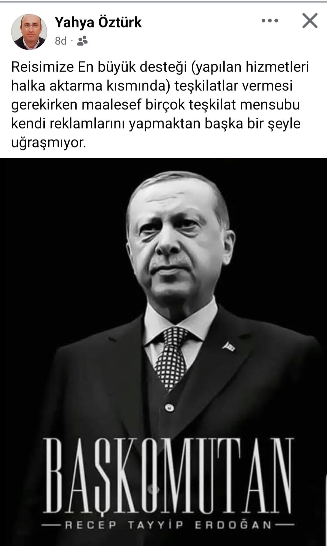 Açıklamasında Cumhurbaşkanı ve AK Parti Genel Başkanı Recep Tayyip Erdoğan’a verilen desteğin önemine dikkat çeken meclis üyesi, “Reisimize en büyük desteği, yapılan hizmetleri halka aktarma noktasında teşkilatlarımızın vermesi gerekir. Ancak ne yazık ki birçok teşkilat mensubu, bu sorumluluğu yerine getirmek yerine kendi reklamını yapma çabasında” dedi.