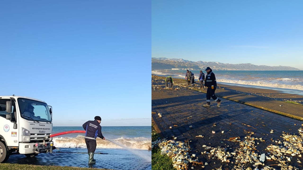 Trabzon Büyükşehir Belediyesi, kentte etkili olan şiddetli fırtınanın ardından Ayasofya sahilinde oluşan olumsuzluklara hızlı ve koordineli bir şekilde müdahale etti. Yoğun dalgaların etkisiyle denizin taşması sonucu Ayasofya sahil yolunda çeşitli atıklar ve birikintiler meydana geldi. Trabzon Büyükşehir Belediyesi Çevre Koruma ve Kontrol Dairesi Başkanlığı ekipleri, sabahın erken saatlerinde yıkama, süpürge ve mıntıka ekipleriyle birlikte kapsamlı bir temizlik çalışması başlattı. Ekiplerin özverili ve koordineli çalışmasıyla sahil yolunda oluşan atıklar kısa sürede temizlenerek yol güvenliği sağlandı. Yapılan çalışmaların ardından Ayasofya sahil yolu yeniden ulaşıma açılarak vatandaşların hizmetine sunuldu.