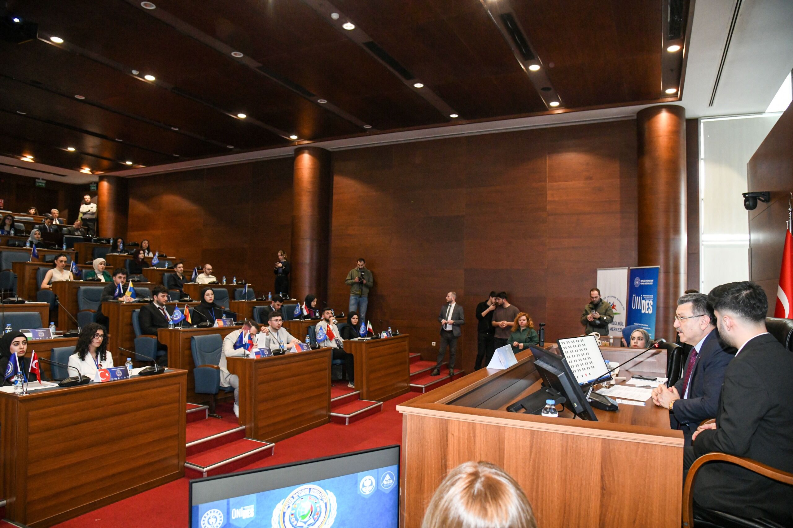 Trabzon Büyükşehir Belediye Başkanı Ahmet Metin Genç, Şehit Eren Bülbül Gençlik Merkezi’nin Üniversite Öğrenci Toplulukları İş Birliği ve Destek Programı (ÜNİDES) kapsamında, Karadeniz Teknik Üniversitesi Avrupa Birliği Kulübü öğrencileri tarafından “Diplomasi ve Kültür Buluşması” çerçevesinde düzenlenen “İsrail–Filistin Krizi ve İki Devletli Çözüm” temalı Birleşmiş Milletler Simülasyonu (MUN) programına katıldı. Trabzon Büyükşehir Belediyesi Ana Hizmet Binası Meclis Salonu’nda, farklı üniversite ve şehirlerden gelen öğrencilerin katılımıyla gerçekleştirilen programda gençlere hitap eden Başkan Genç, “Gençlerimizle bir arada olmak bizim için çok kıymetli. Çünkü hem bugünümüzü hem geleceğimizi gençlerimiz inşallah şekillendirecek. Dolayısıyla bir taraftan teoriyle bir birikim sahibi olduğumuz aşamada aynı zamanda işin pratiğiyle de ilgilenmek lazım. MUN toplantılarının ben bu manada çok fayda getireceğini düşünüyorum. Özellikle sizin gelişiminize, gelecek projeksiyonunuza çok fayda sağlayacağını düşünüyorum. Çünkü erken öğrenmek, erken uygulamak her zaman geleceğe dair ciddi bir avantajdır” dedi.