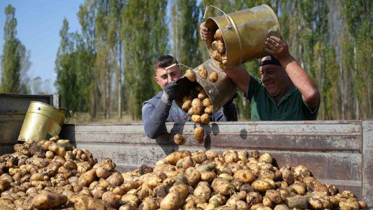 Ailesiyle birlikte el birliğiyle yapılan hasatta patatesin tarladan sofraya uzanan zahmetli yolculuğu sona ererken, yüksek verim hem üreticiyi hem de köy halkını sevindirdi.