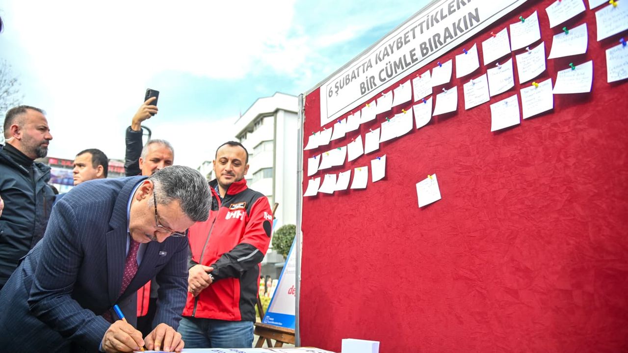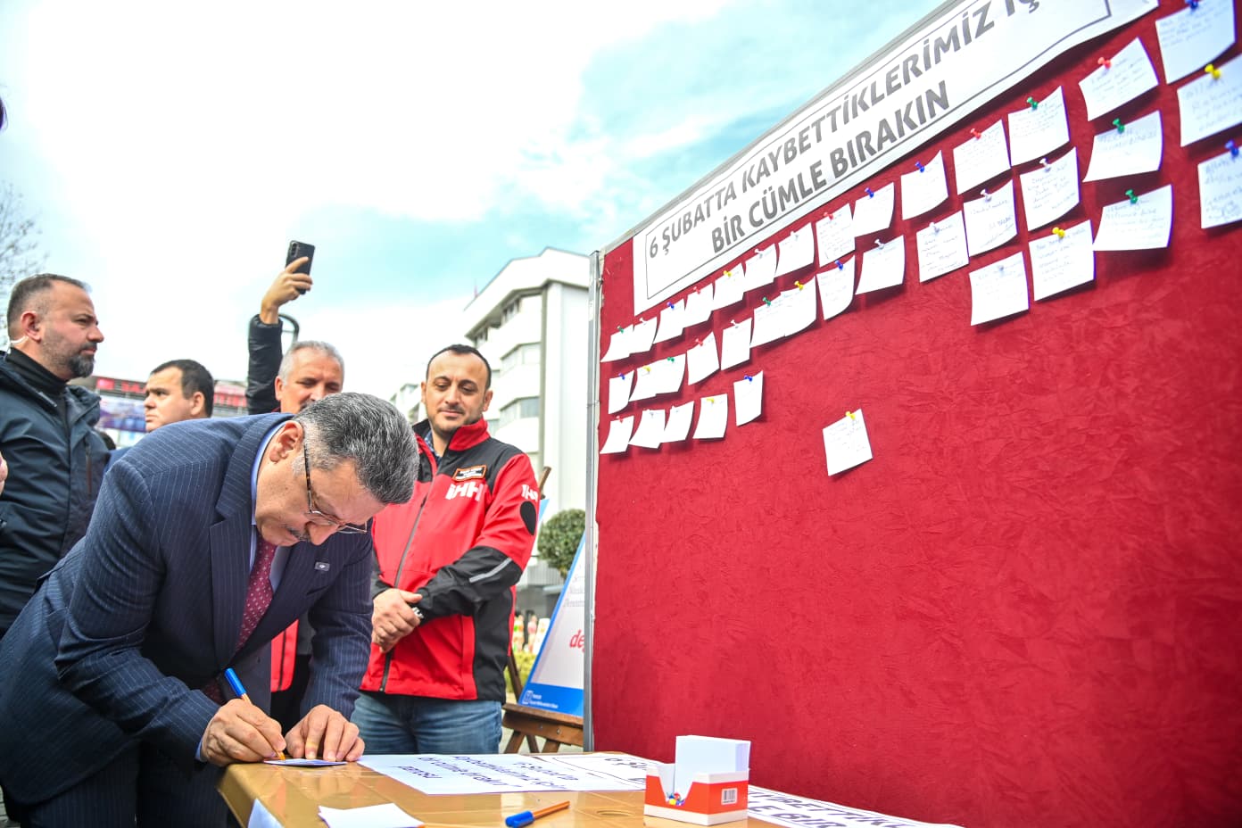 Trabzon Valisi Tahir Şahin ise, “Deprem konutlarının yapımları tamamlandı. Toplumsal iyileşmemizi sağlamamız gerekiyordu bu da birliktelikle sağlandı. Depremin ilk günü Hatay’daydım, yaklaşık 4 ay depremin ilk anını yaşayarak mücadele ettik. Biz oralarda Trabzonlu hemşehrilerimizden ve tüm ülkemizden gelen yardımlarla acıyı paylaştık. Bugün Trabzon’da üniversitemizin ön görebilmek adına çok kıymetli çalışmalar yaptığına şahit olduk. Bu noktada şehrin bütün dinamikleri ile Büyükşehir Belediyemizin, ilçe belediyelerimizin imkan ve kabiliyetleri ile şehrimizde oluşabilecek riskleri önceden ön görebilen bir yönetim anlayışı ile memleketimize hizmet etmeye gayret edeceğiz” diye konuştu. Katılımcılar, depremde ölenleri anmak için alanda kurulan '6 Şubat'ta kaybettiklerimiz için bir cümle bırakın' başlıklı panoya, duygularını yazdıkları not kağıtları yapıştırdı.
