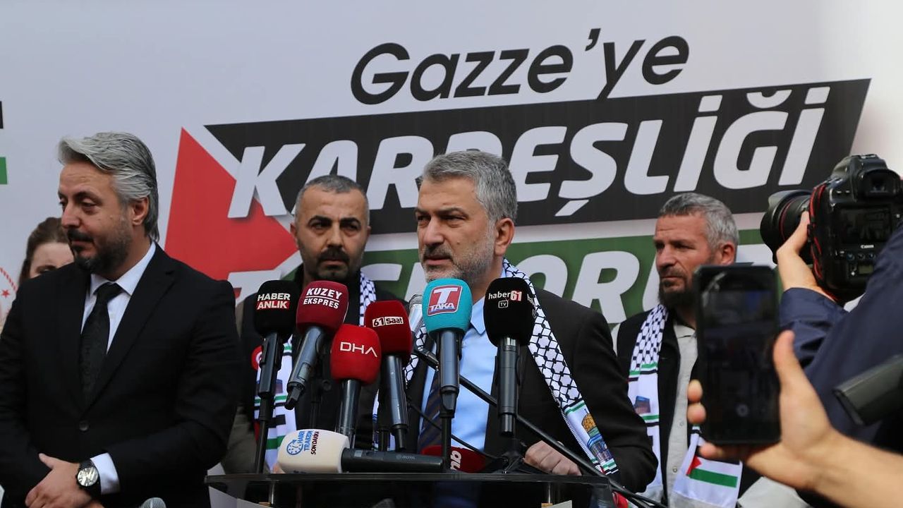 AK Parti Trabzon İl Başkanı Dr. Sezgin Mumcu, Trabzon Büyükşehir Belediyesi, İl Milli Eğitim Müdürlüğü ve Hayrat Vakfı öncülüğünde hazırlanan Gazze yardım tırlarının dualarla uğurlandığı törende konuştu.