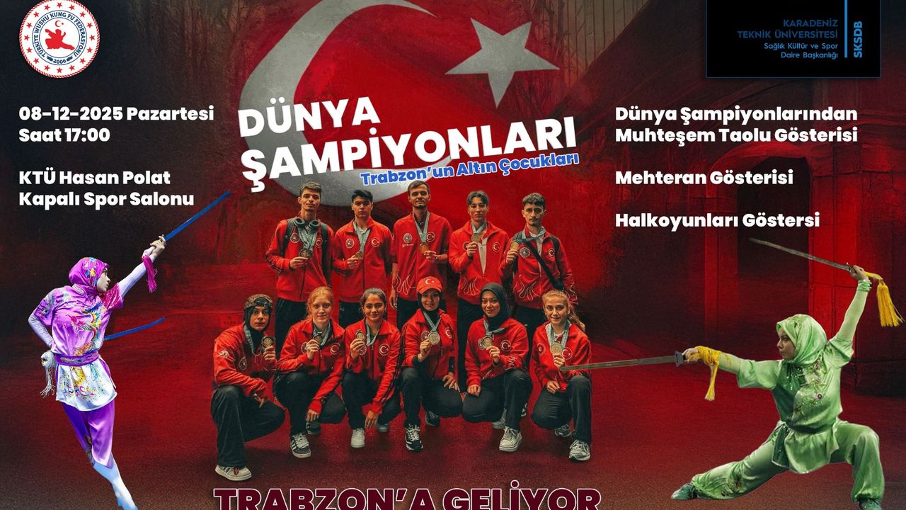 Türkiye Wushu Kung Fu Federasyonu’nun gurur kaynağı olan Dünya Şampiyonları, 8 Aralık 2025 Pazartesi günü Trabzon’da özel bir gösteri programıyla sahne alacak. Karadeniz Teknik Üniversitesi Sağlık Kültür ve Spor Daire Başkanlığı (SKSDB) tarafından düzenlenen etkinlik, KTÜ Hasan Polat Kapalı Spor Salonu’nda saat 17.00’de gerçekleştirilecek.