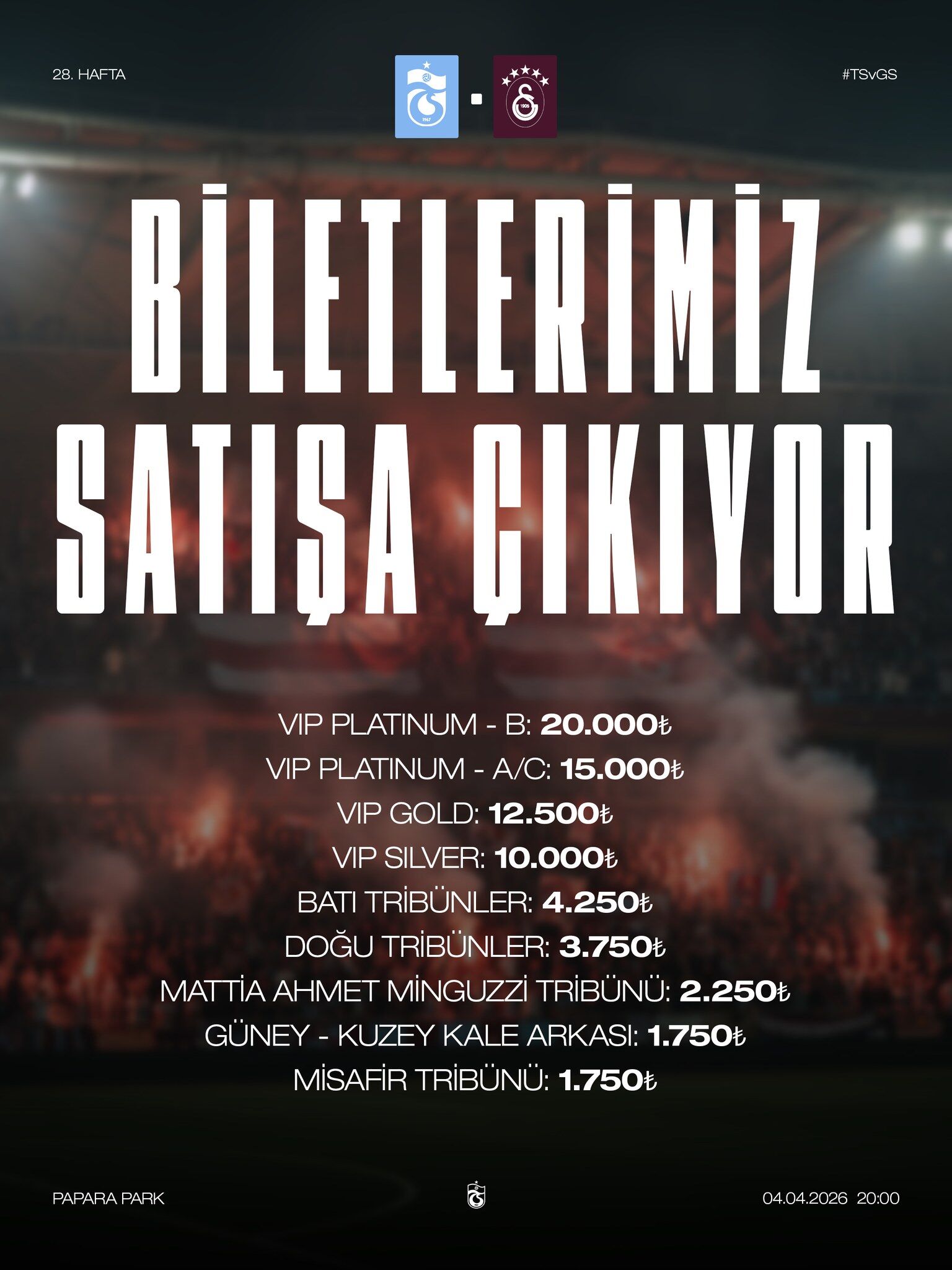 Trabzonspor'un Trendyol Süper Lig Mehmet Ali Yılmaz Sezonu’nun 28. haftasında Galatasaray ile oynayacağı maçın biletleri bugün saat 20.00’de satışa çıkıyor.