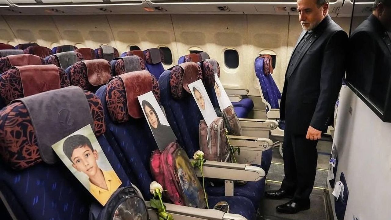 İran heyetini Pakistan'a götüren uçağa ABD'nin Minab kentindeki bir ilkokula düzenlediği saldırıda hayatını kaybeden çocukların fotoğrafları, ayakkabıları, çantaları ve beyaz gül konuldu.