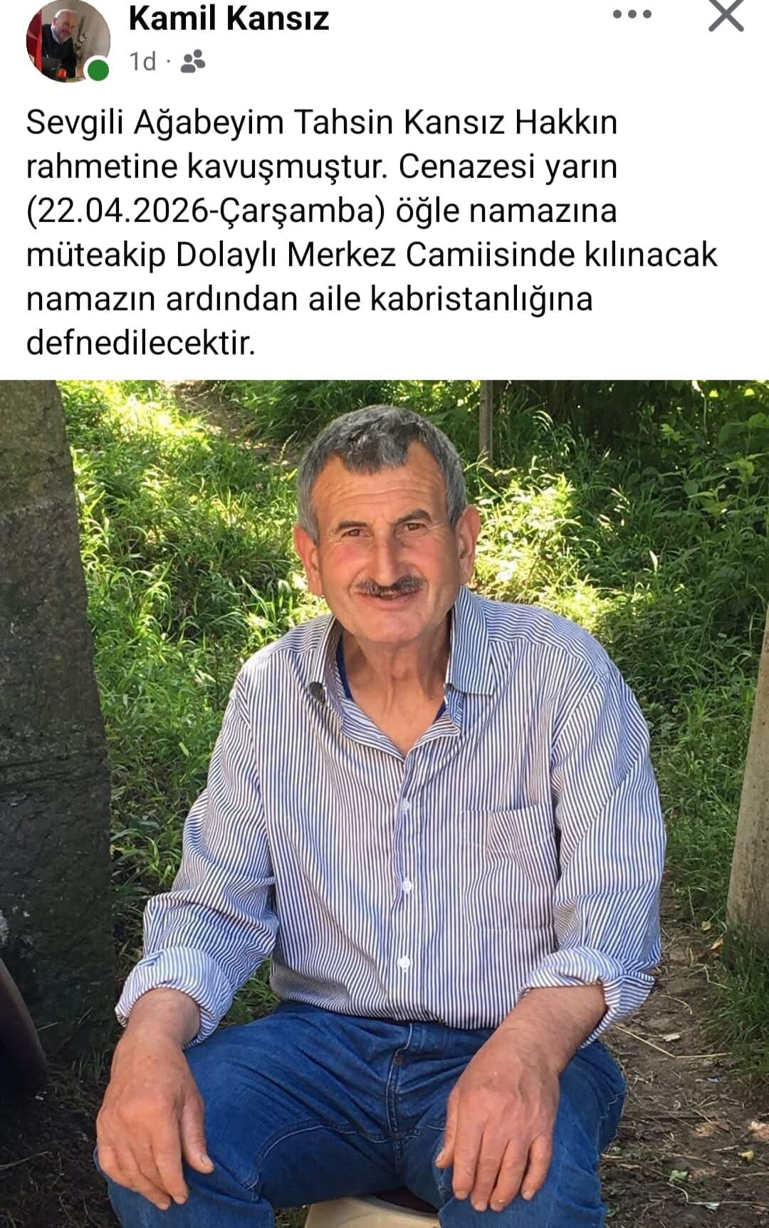 Tahsin Kansız’ın cenazesi, 22 Nisan 2026 Çarşamba günü öğle namazına müteakip Dolaylı Merkez Camii’nde kılınacak cenaze namazının ardından aile kabristanlığına defnedilecek.