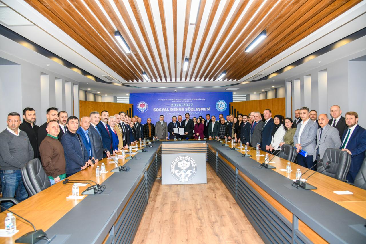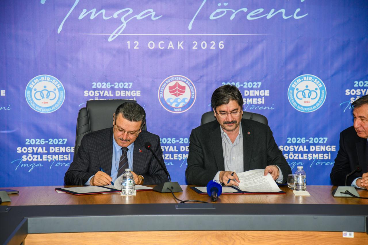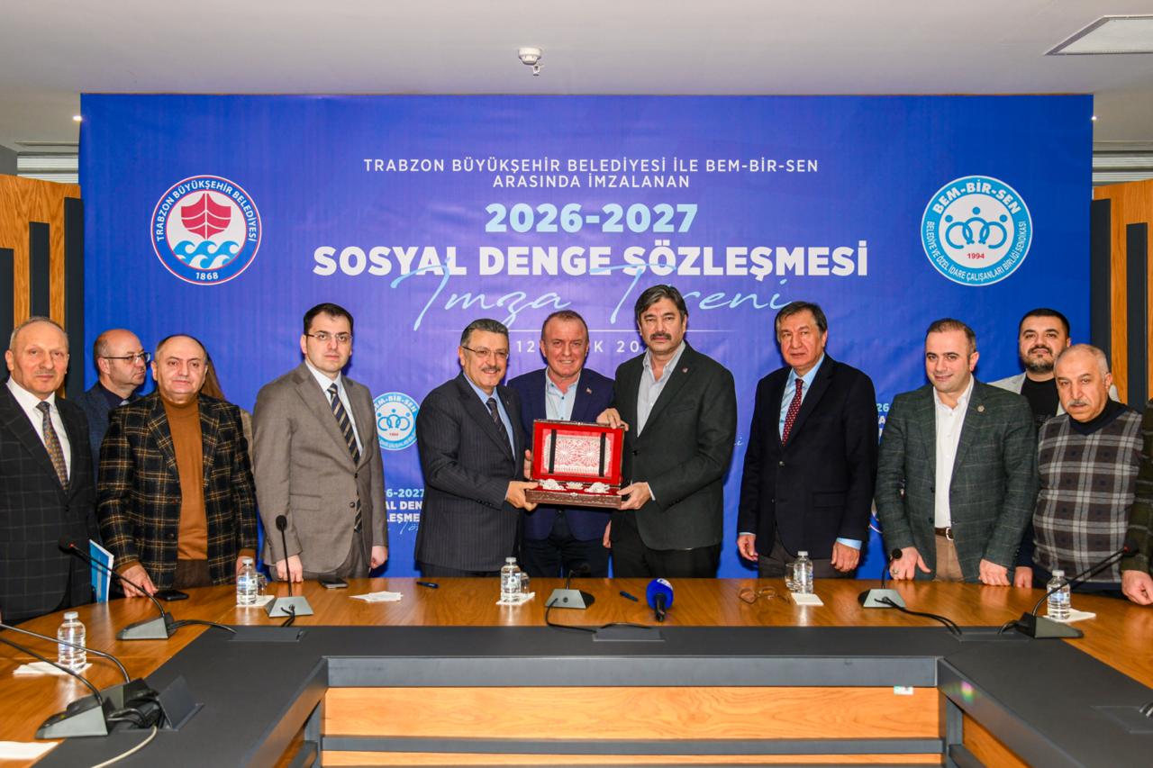 Trabzon Büyükşehir Belediyesi ve TİSKİ’de çalışan 1383 memurun sosyal haklardan en üst seviyede yararlanması adına, Trabzon Büyükşehir Belediyesi Toplantı Salonu’nda Büyükşehir Belediye Başkanı Ahmet Metin Genç ve Bem-Bir-Sen Genel Başkanı Levent Uslu arasında imza töreni düzenlendi. İmzalanan protokol doğrultusunda, Sosyal Denge Sözleşmesi kapsamındaki ödemelere tavan oran üzerinden zam yapılarak memurların gelirlerinde iyileştirme sağlandı. Çalışanların menfaatini gözetmeye özen gösterdiklerini ifade eden Büyükşehir Belediye Başkanı Ahmet Metin Genç, “Bizler, Büyükşehir Belediyesi ve bağlı kurumumuz TİSKİ’de görev yapan tüm mesai arkadaşlarımızın memnuniyetini ve huzurunu her zaman ön planda tuttuk. Sosyal Denge Sözleşmesi de bu anlayışın somut bir göstergesidir. Sendikamızla uzun yıllardır karşılıklı anlayış ve empatiyle çalışıyoruz. İmkanlarımız dahilinde çalışanlarımızın menfaatini gözetmeye özen gösteriyoruz. Memur personelimizi kapsayan bu sözleşmenin hayırlı olmasını diliyor, emeği geçen sendika yöneticilerimize ve özellikle sürece bizzat katılan Genel Başkanımıza teşekkür ediyorum. İnşallah hep birlikte verimli, huzurlu ve başarılı bir çalışma dönemini Rabbim bizlere nasip eder” ifadelerini kullandı.