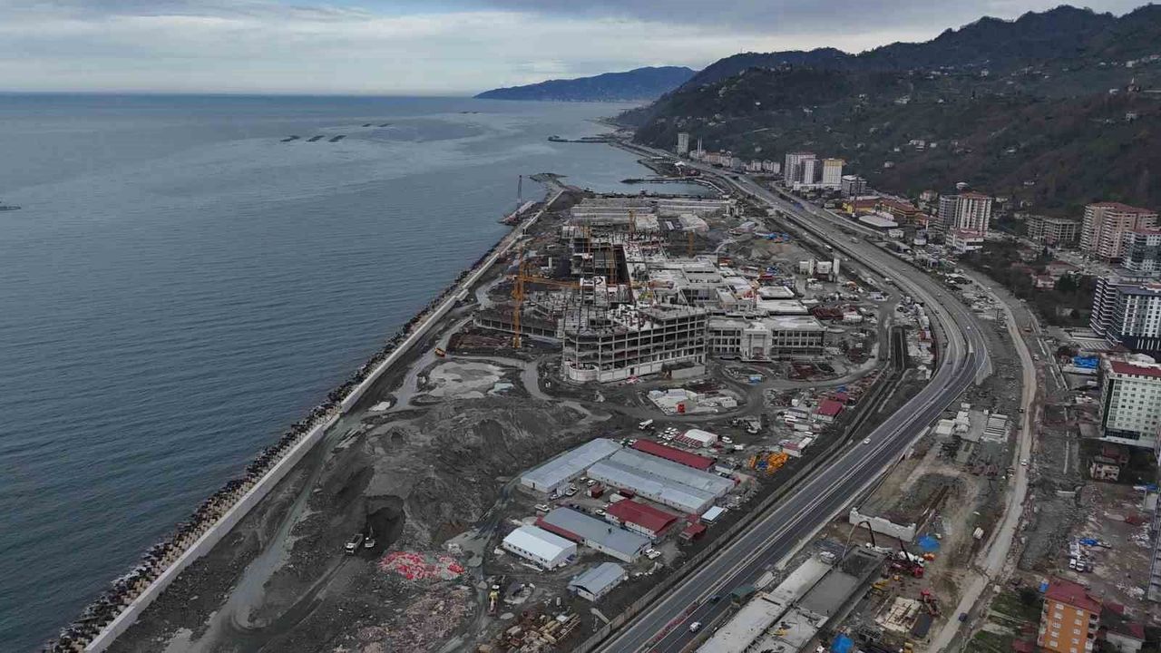 Rize'de bin 53 yatak kapasiteli şehir hastanesi inşaatında zemin iyileştirme ve beton çalışmalarında sona yaklaşılırken, cephe ve mekanik işlerde yoğun mesai sürüyor.