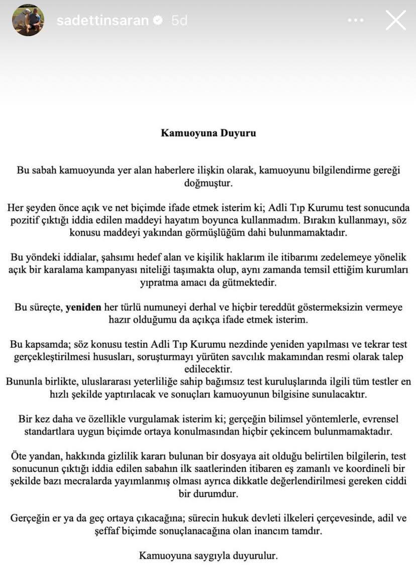 Saran açıklamasında, Adli Tıp Kurumu test sonucunda pozitif çıktığı iddia edilen maddeyi hayatı boyunca kullanmadığını vurgulayarak, “Bırakın kullanmayı, söz konusu maddeyi yakından görmüşlüğüm dahi bulunmamaktadır” ifadelerini kullandı.