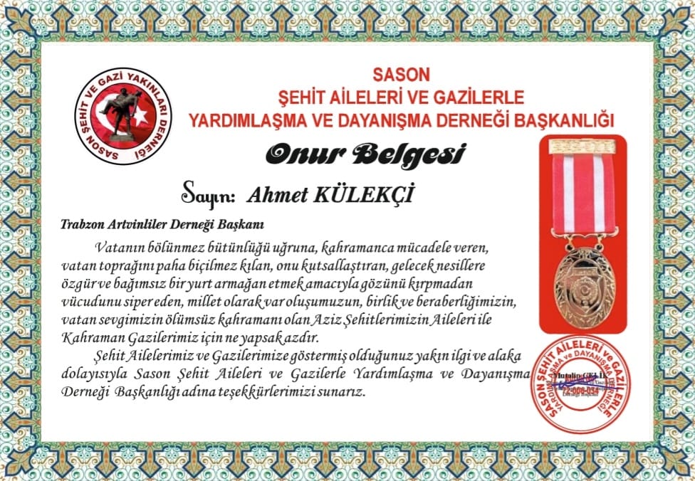 Onur Belgesinde şu ifadelere yer verildi " Vatanın bölünmez bütünlüğü uğruna kahramanca mücade veren vatan toprağının paha biçilmez kılan onu kutsallaştıran gelecek nesillere özgürce bağımsız bir yurt armağan etme amacıyla gözünü kırpmadan vücudunu siper eden millet olarak var oluşumuzun birlik ve beraberliğimizi vatan sevgimizin ölümsüz kahramanı olan Aziz Şehitlerimizin Aileleri ile kahraman Gazilerimiz için ne yapsak azdır.Şehit Ailelerimiz ve Gazilerimize gösterdiğiniz yakın ilgi ve alaka dolayısıyla Batman Sason Şehit Aileleri ve Gazilerle Yardımlaşma ve Dayanışma Derneği olarak şahsınıza ve Derneğinize teşekkürlerimizi sunarız"