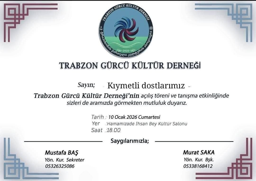 "Trabzon Gürcü Kültür Derneği" 10 Ocak 2026 Cumartesi günü Hamamizade İhsan Bey Kültür Salonu’nda düzenlenecek açılış töreni ve tanışma etkinliğiyle faaliyetlerine resmen başlayacak.