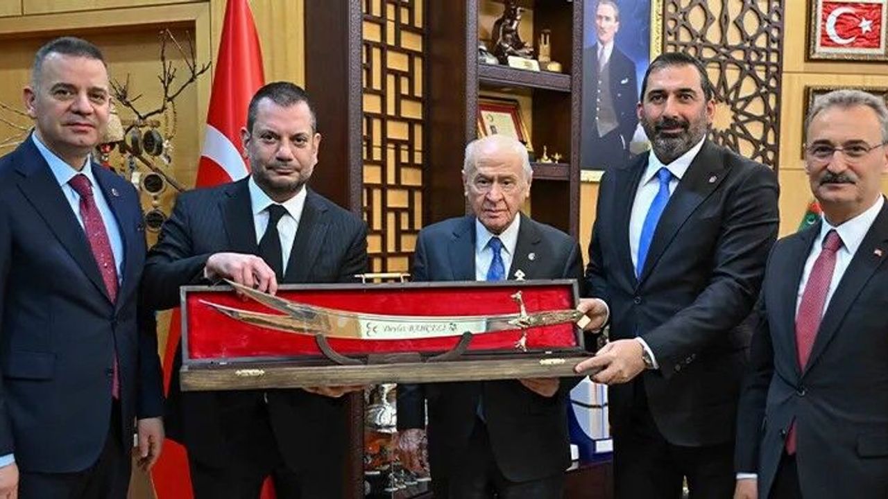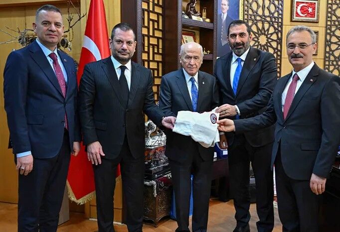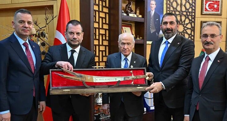 Ziyarette Bahçeli'ye, kulübün tarihindeki önemli dönüm noktalarından biri olan 1975-1976 sezonunu simgeleyen retro beyaz formanın yanı sıra işlemeli bir kılıç hediye edildi.